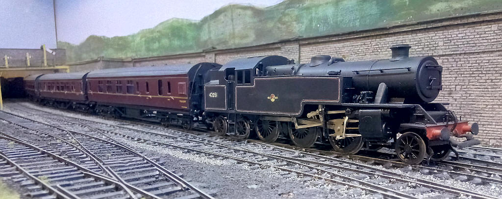 Although the coaches won't be run on my Halifax Midland layout, as the platforms are too short, I've photographed them in this location because of the good lighting. The Fairburn 2-6-4T is a model built, I believe, by Alan Gibson from one of his own kits. I've had to do quite a bit of modifications to it mechanically to get to run on my layouts. It's also had coupling loops made out of brass wire with a buffing plate of brass strip soldered to the wire. This bar allows the loco to propel trains without buffer-locking.