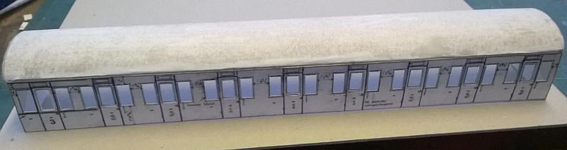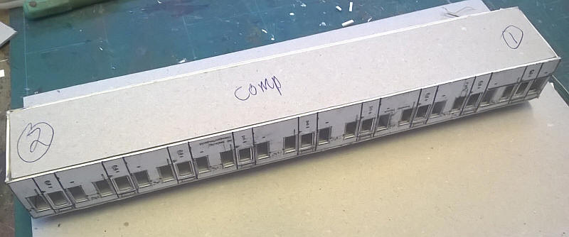 Later versions of these cardboard roofs were refined slightly. As mentioned above the base of the roof structure was 42mm. A further 7 layers of 1mm thick mounting board, all 265mm long were glued inside the roof. In descending order these were 40, 38, 36, 34, 28, 22 and 14mm. A final 5mm strip of thin card was glued along the centre line of the roof. This gives an accurate profile to the roof and should allow easy repetition when constructing more card carriages.