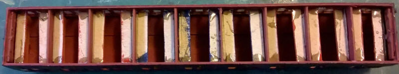 The underframe bracing has been added. First of all two lengths of copperclad sleeper strip are glued to the floor.