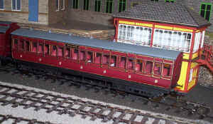 To start the process I've already constructed a zinc sided coach produced some years ago by a Mr Charlton. The results can be seen in the photo below. The only difference in construction to my card coaches is that I've used plasticard to produce the internal carriage structure, to which the sides are attached with Araldite. The arc roof was built up on a base layer of thick card to which further strips, each slightly narrower than the last were added until a rough roof profile was obtained. On top of this I glued two layers of thin card to represent the outer roof surface.