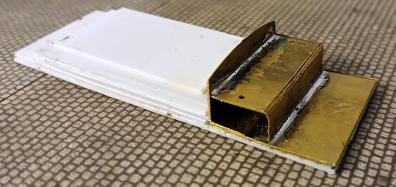 The brass parts for the rear of the tender top were reduced in width slightly to allow them to slot in place between the tender sides. Strips of plastic were added around the hole in the base up to the level of the top of the motor and then a smaller rectangle of plastic was glued over the hole. Eventually all the plastic will be painted black and coal added.
