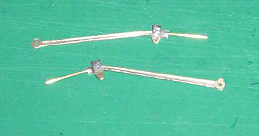 Another piece of n/s 4mm by 8mm had a hole drilled at one end and at the opposite end a length of .9mm brass rod (for the piston rod) was soldered on. This was passed over the pin but not soldered in place.