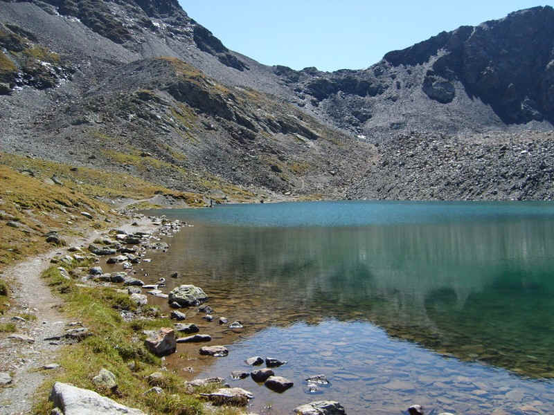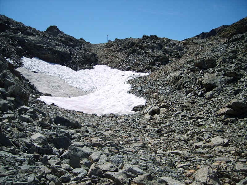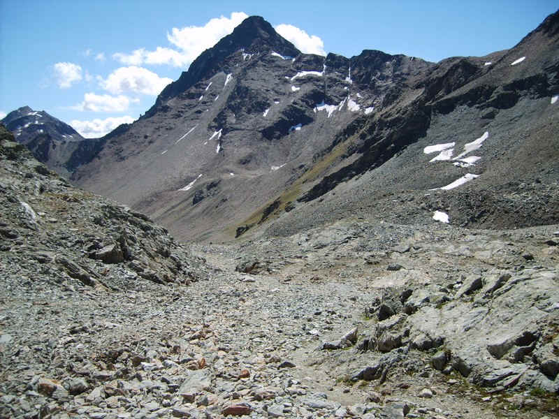 There's a clear path most of the way through stones, boulders and glacial debris.