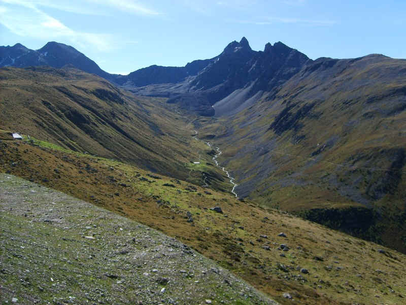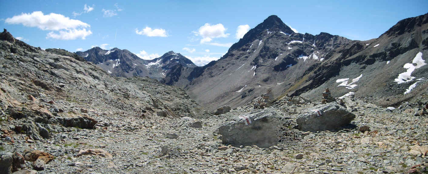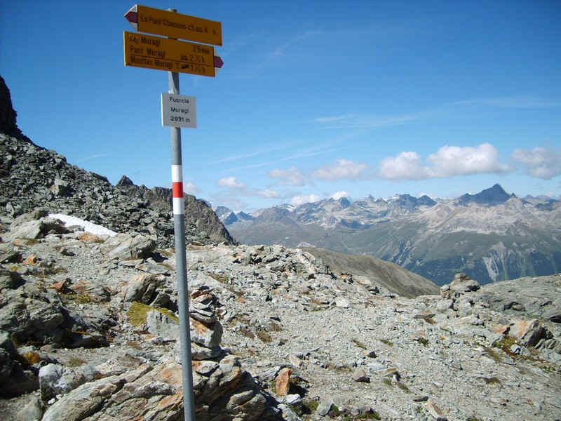 The first stage of the route to Chamues-ch follows the path to the lake at Lej Muragl and then on to the pass at Fuorcla Muragl, which is the low point on the skyline in the photo above. To the right of Val Muragl are Piz Muragl and beyond Piz Languard.