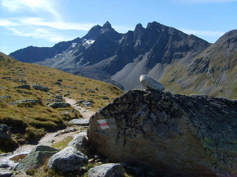 Beyond the pass the track is much less well defined, although there are red and white way marks. Care would be needed in mist to avoid loosing the path.