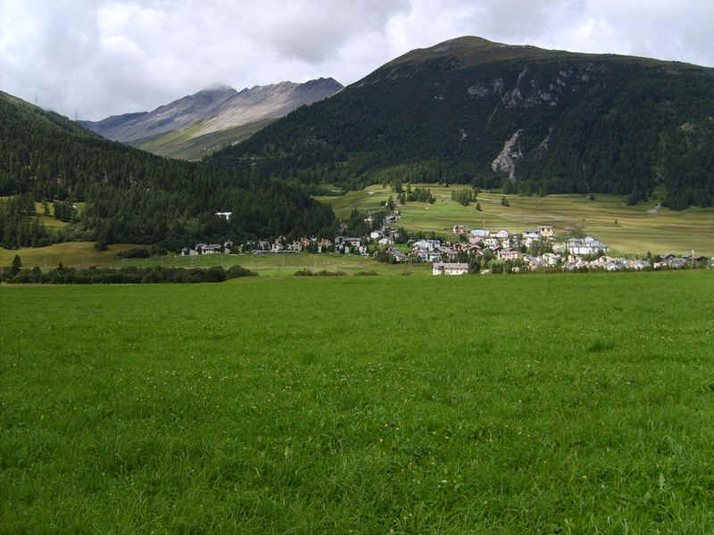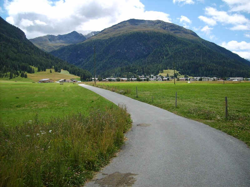 Across the meadows is the village of La Punt with the Albula Pass road just visible up the valley.