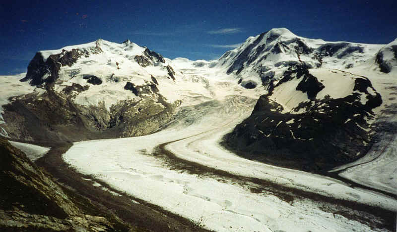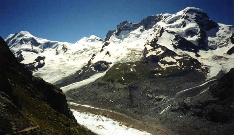 The end of the Gornergletscher with Liskamm, Castor, Pollux and the Breithorn (left to right)