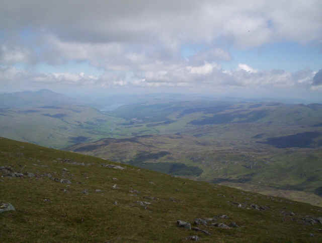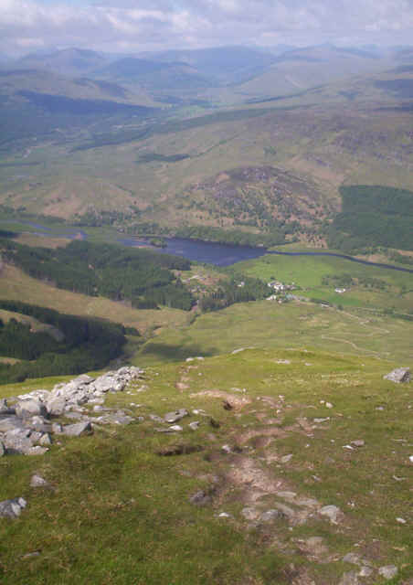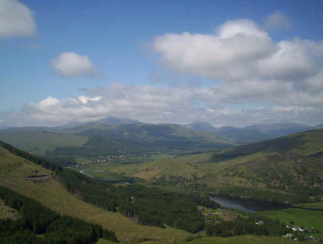 Looking down towards Crianlarich and Starth Fillan. Ben Lui, Ben Oss and Beinn Dubhcraig dominate the background.