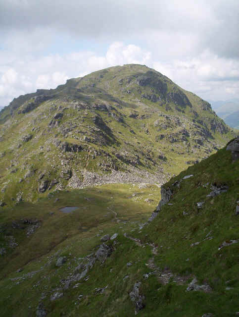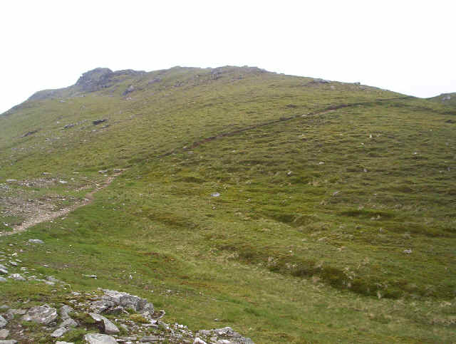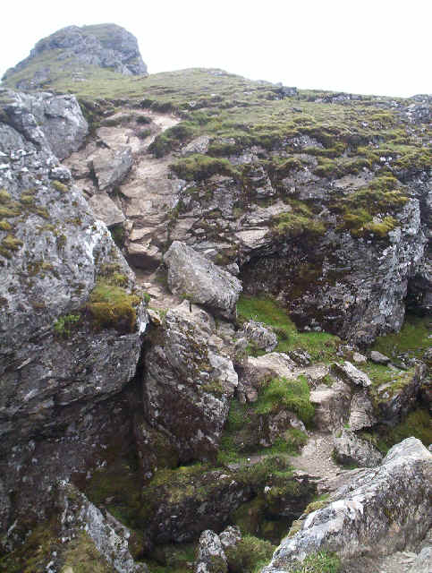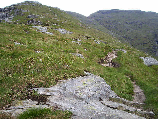 From the bealach this view is looking back to An Caisteal with the steep path clearly visible.