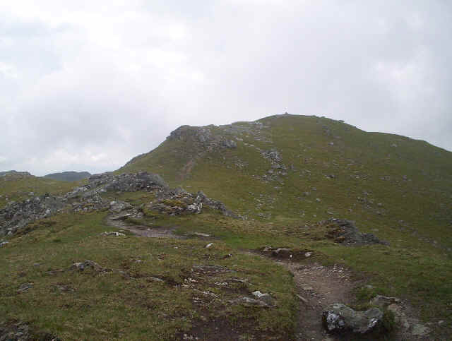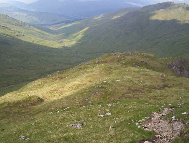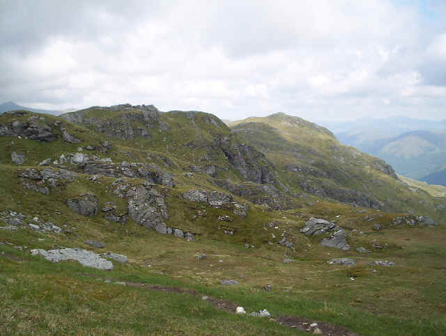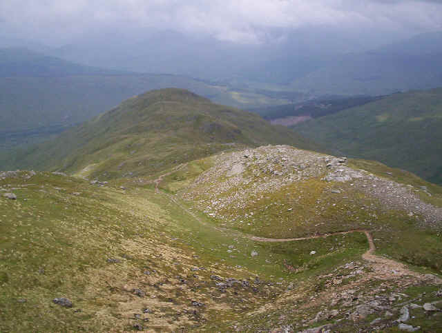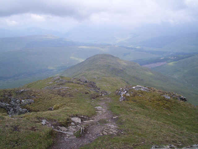 Looking back down the ridge from near the summit with Crianlarich in the distance.