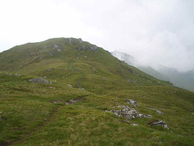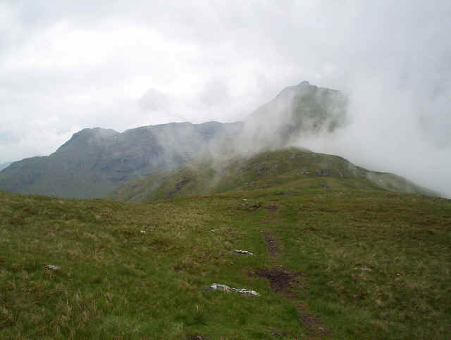 The mist kept swirling around but was promised to clear later. Here I'm crossing Twistin Hill with An Caisteal's summit peering through the mist. Beyond lies Beinn a'Chroin.