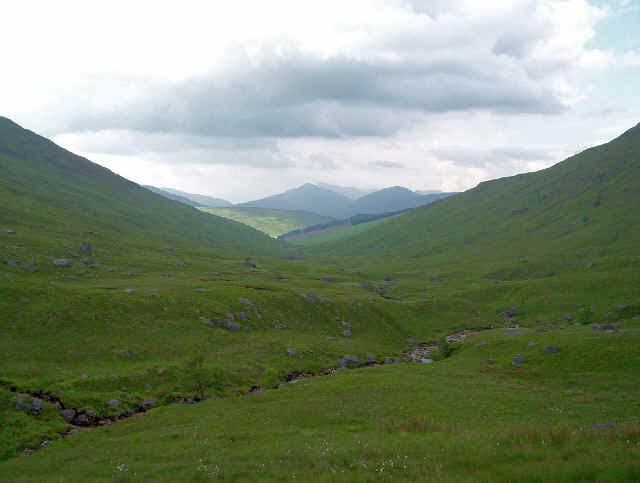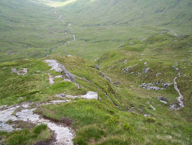 Once down in Coire Earb the walking changes totally. The valley of the River Falloch is boggy and the track, despite what the maps might suggest, is virtually invisible. Just keep heading down stream avoiding the wettest patches. In the dry conditions of June 2008 it was easy but I dread to think what it must be like when there's been weeks of rainfall. Eventually you'll arrive back at the vehicle track where you started the day.
