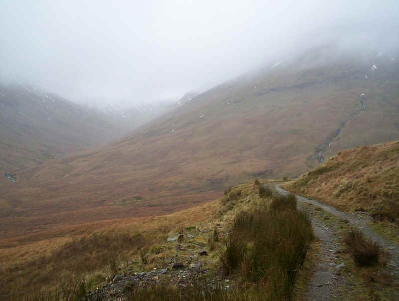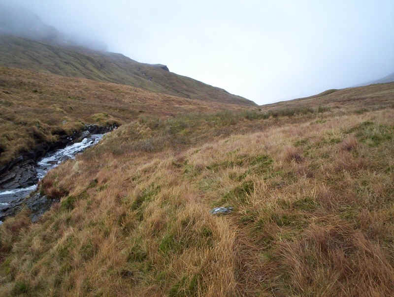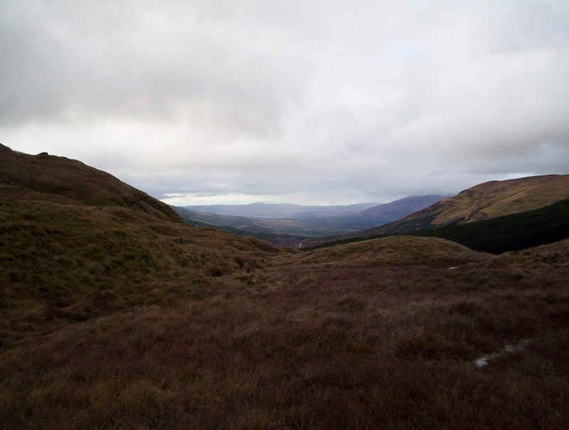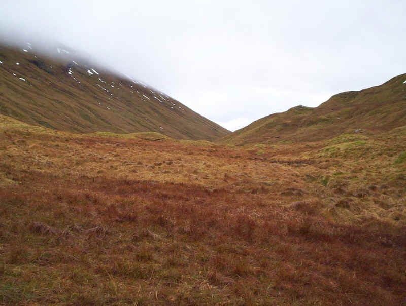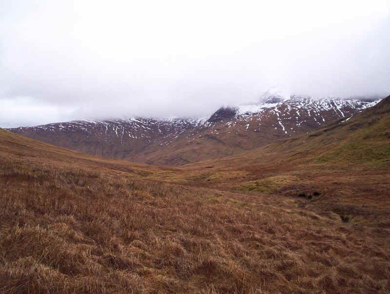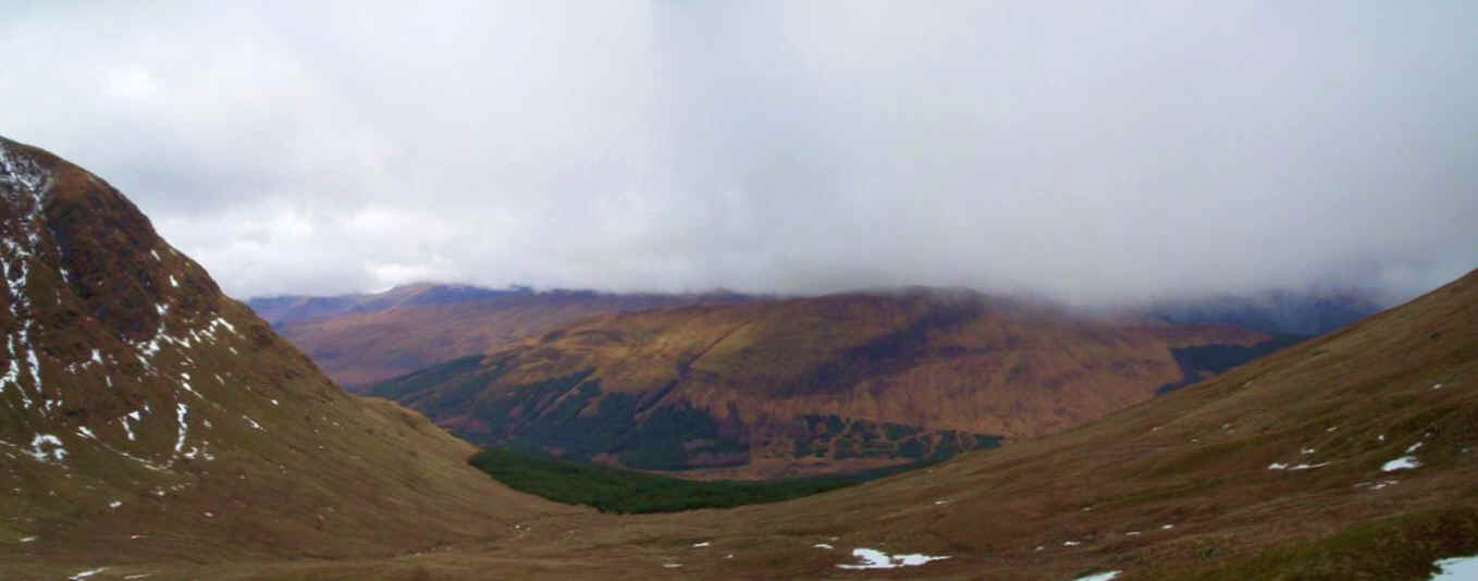 Looking back down into the corrie with cloud still blanketing the Cruachan hills.