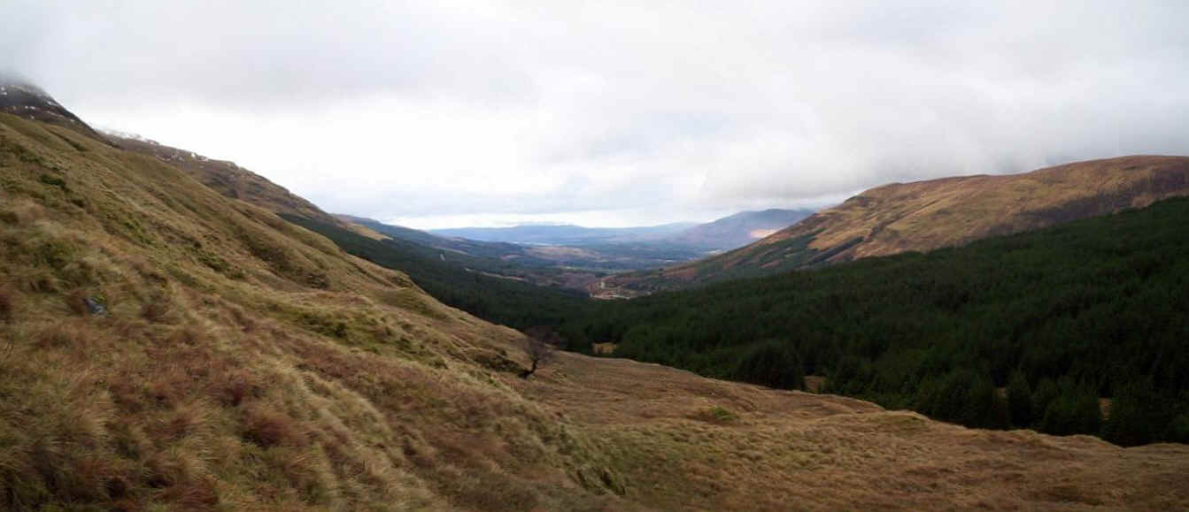 A view opens up at the pass with Loch Awe visible in the distance and cloud covered Ben Cruachan.