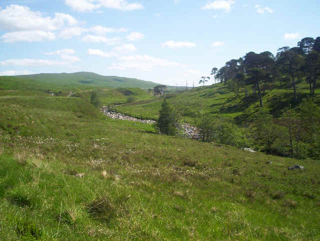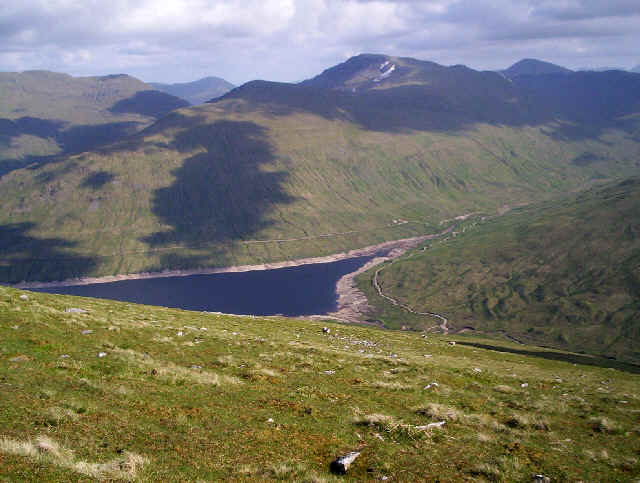 I allowed myself the luxury of a quarter of an hour to eat the "Green Welly Shops" sandwiches and a banana before heading down hill towards the, now extended, vehicle track that runs along Loch Lyon and down the Auch Gleann. It's a steep slope and at the end of a long day felt interminable. Rather than take what might be the most obvious route diagonally down the slope I headed towards an unnamed stream at about NN368 405 and followed this down to the summit of the road.