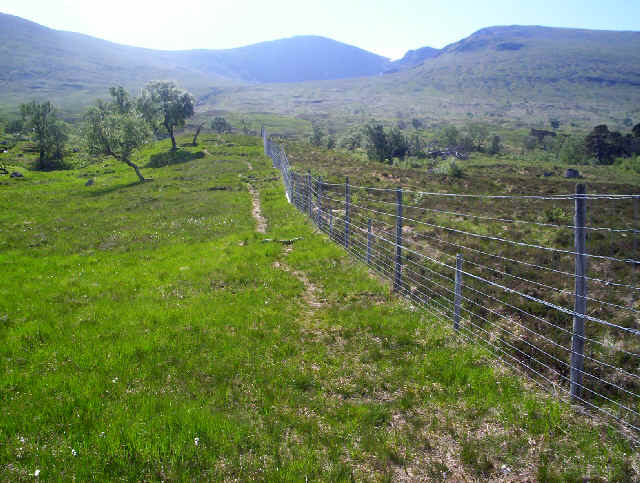 Beyond the railway this deer fence is followed until you reach the Allt Coire an Lochain stream.