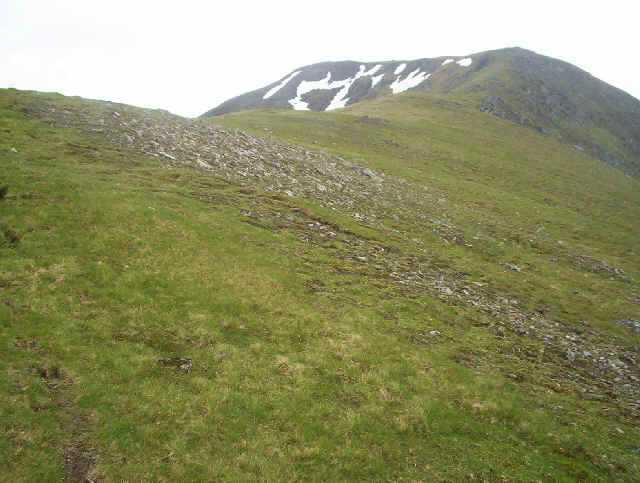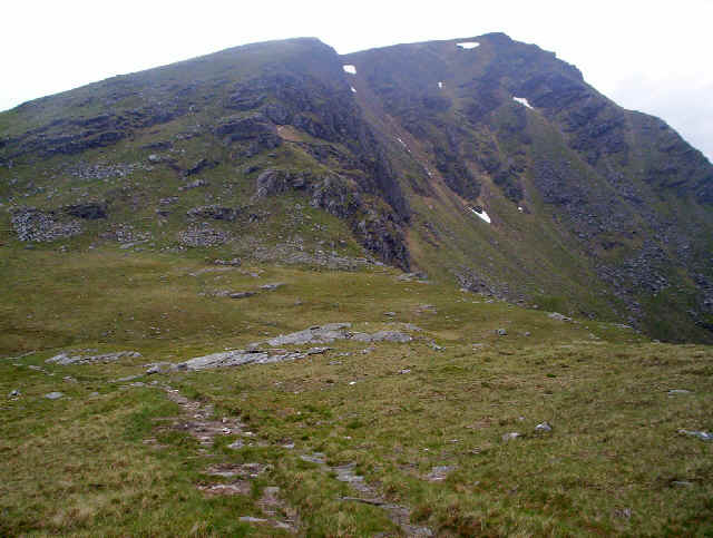 The faint track heads down hill towards the bealach at Coire Daingean.