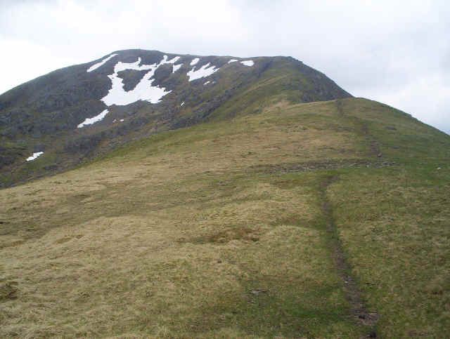 The rather undistinguished top of Meall Buidhe with the next goal of Beinn Achaladair beyond.