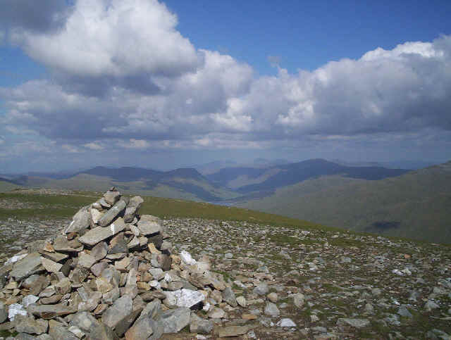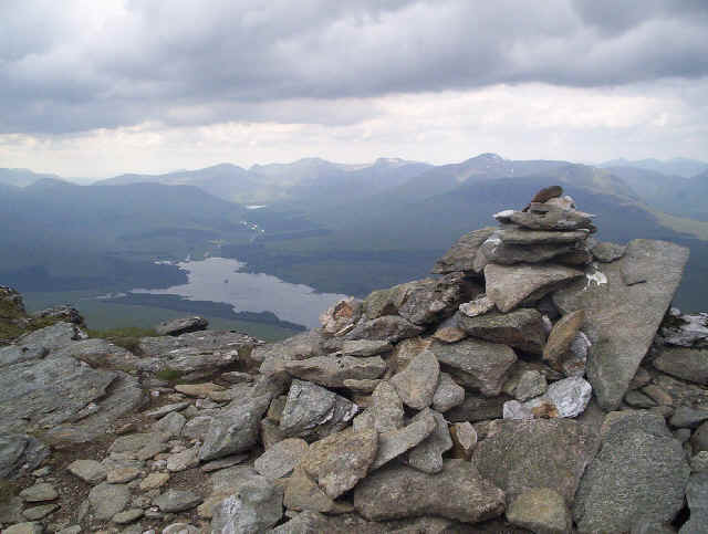 The summit cairn of Beinn Achaladair stands on the top of its cliffs and has a dramatically exposed feel to iton the north western side. Below can be seen Loch Tulla. It had taken me 1 hour and 25 minutes from Beinn a' Chreachain, compared to the expected one hour in the SMC book. I was beginning to wonder if going onto the third hill was going to be possible.