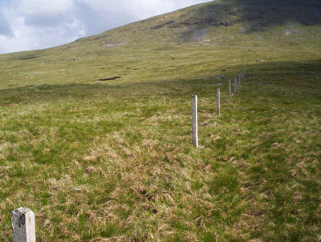 The decision was made easy by the presence of a good stalkers' path which starts at the bealach and heads gently down the slopes of Beinn Achaladair towards the watershed between the Gleann Cailliche and the Auch Gleann. In the photo this is the low point in the centre of the photo. It's about at about 610 m and is conveniently marked by a row of old fence posts. The col here is rather peaty and in normal Scottish weather probably rather boggy but with the dry weather easily crossed.