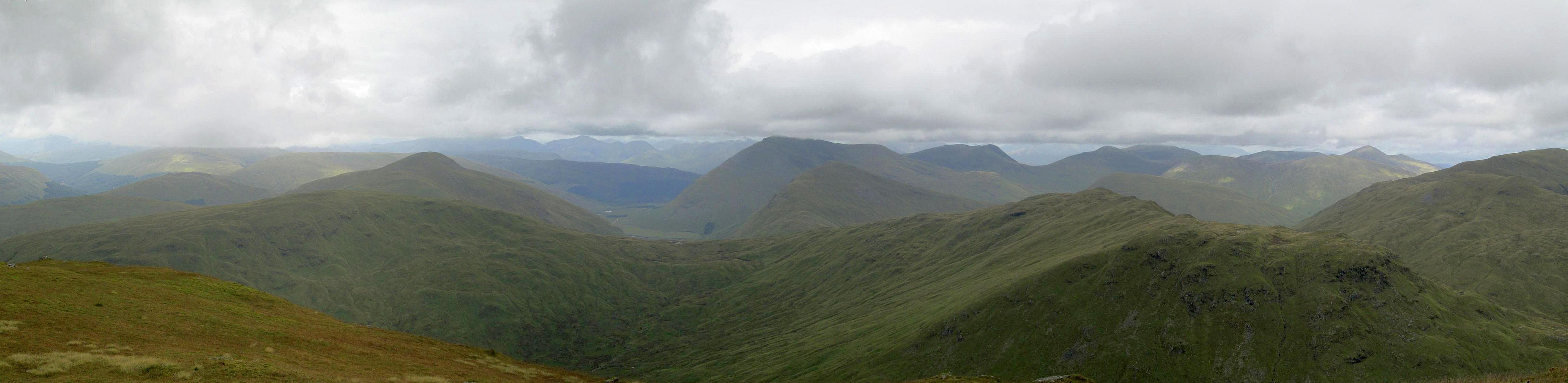 To the South the Crianlarich Hills - Stob Garbh, Cruach Ardrain, Beinn a'Chroin, An Caisteall and Ben Chabhair.