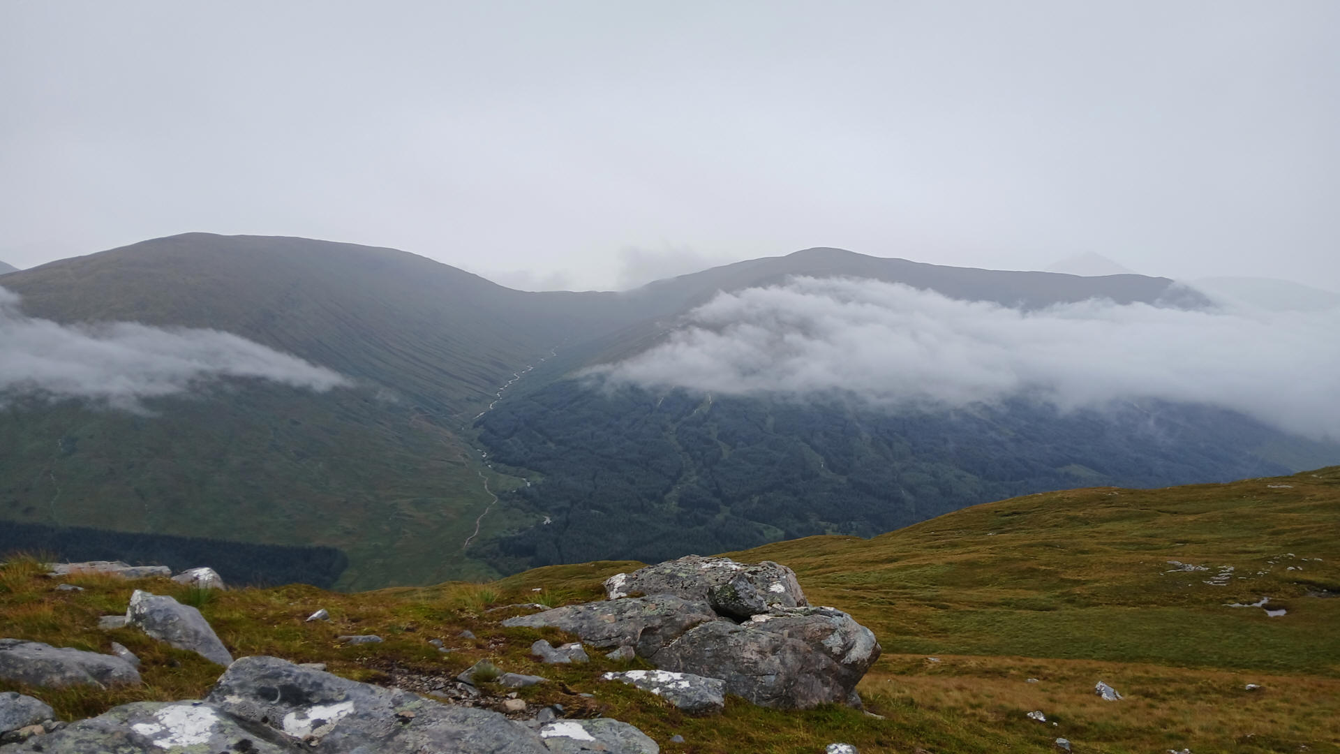 On the way down the hill back to the West Highland Way weather conditions slowly improved and, after it stopped raining, I used the camera on my mobile phone to get some panoramic photos of the surrounding hills.