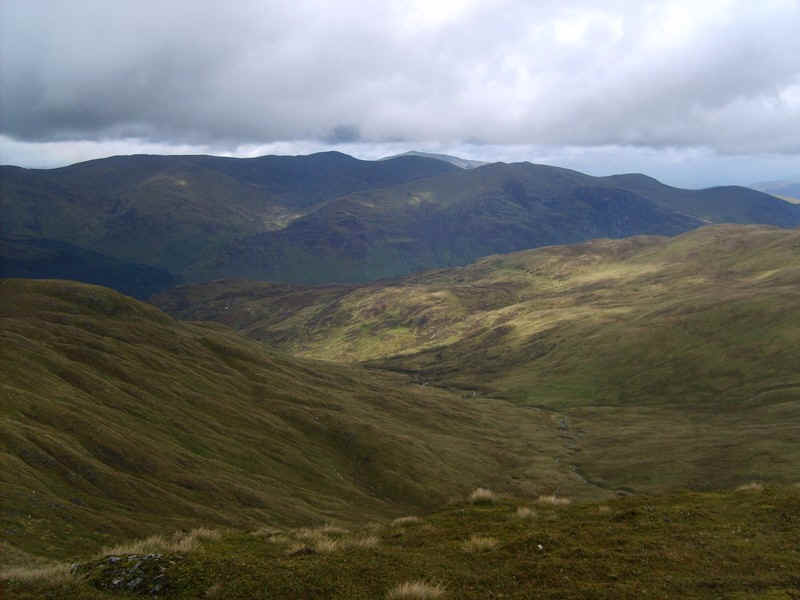 Over to the east are the hills I wanted to climb on this walk. From right to left; Meall Garbh, An Stuc and Ben Lawers.