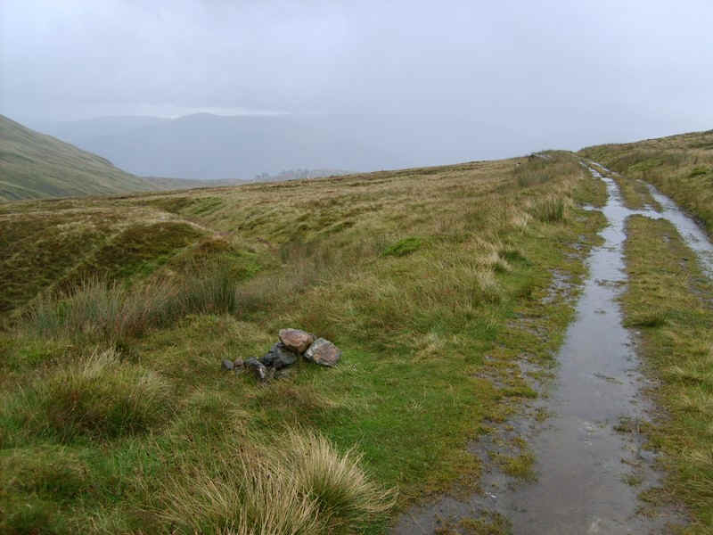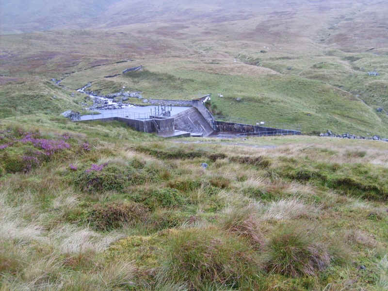 Towards the bottom of the ridge the next obstacle comes into view, the enormous marshy peat bog which is over a kilometre across. Despite the ground being wet after the dismal summer of 2011 it was still quite easy to walk across. I'd entered the grid reference for the dam at the end of the hydro vehicle track and used my GPS to walk to this point.
