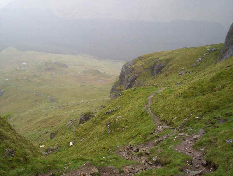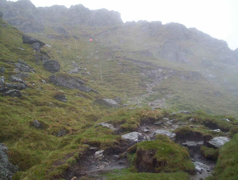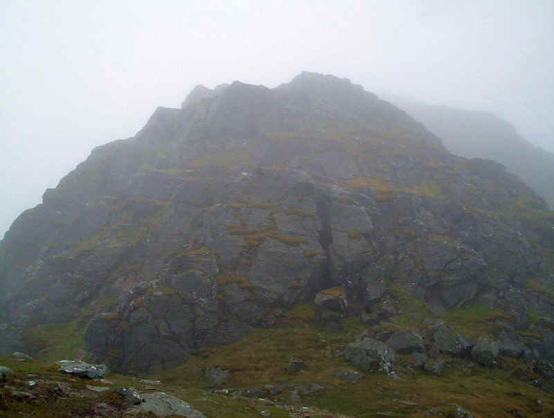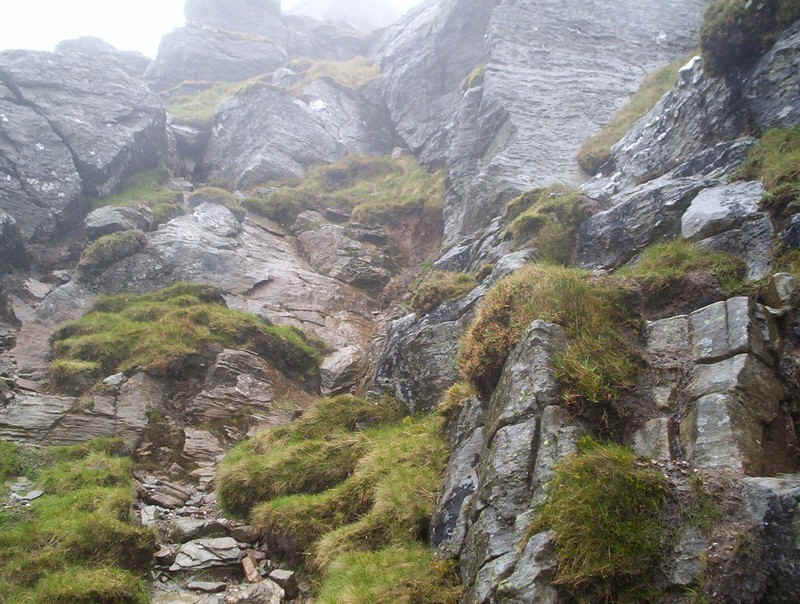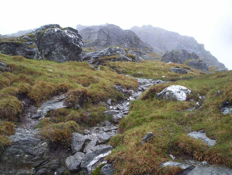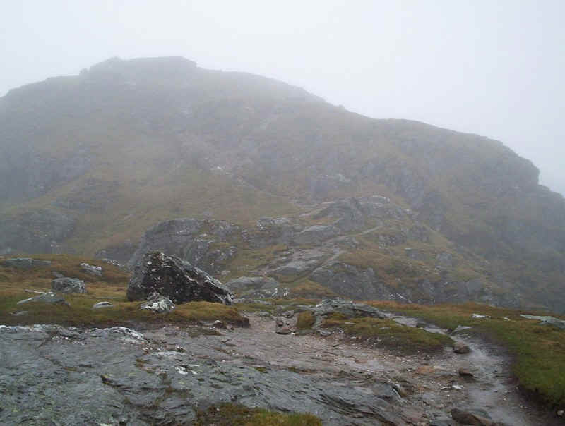 ...way up through the rocks and the summit comes into view through the mist.