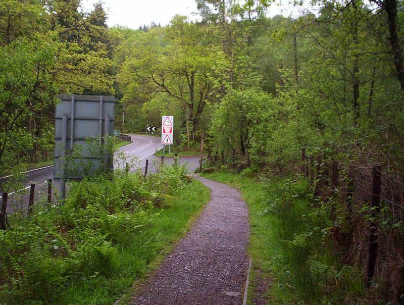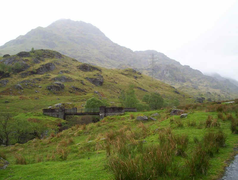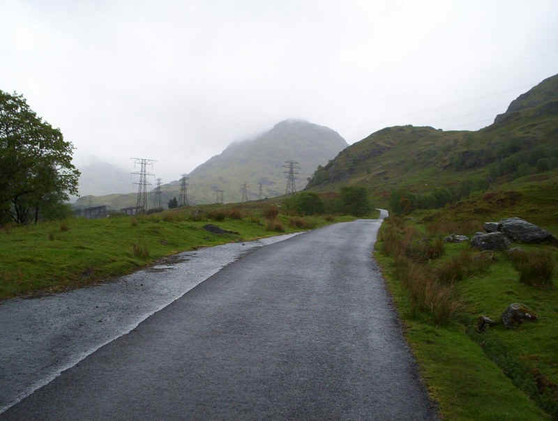 After passing under the railway bridge, the paved road up to the Sloy dam was taken with a rather cloudy Ben Vane in view.