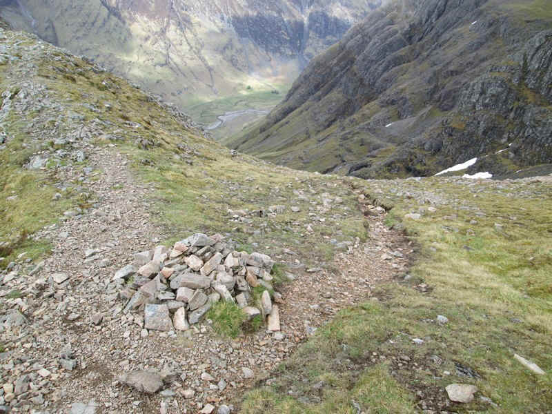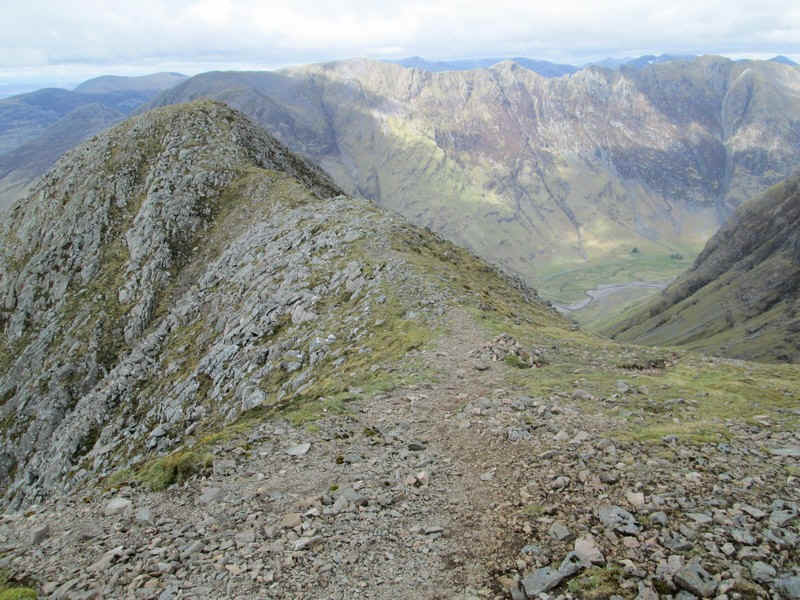 The initial objective of the walk to Bidean nam Bian is to reach the ridge at the Bealach An t- Sron which can be seen straight above the path. Stob Coire nam Beith (1107m) is to the left and will be crossed on the way to Bidean nam Bian. (down)