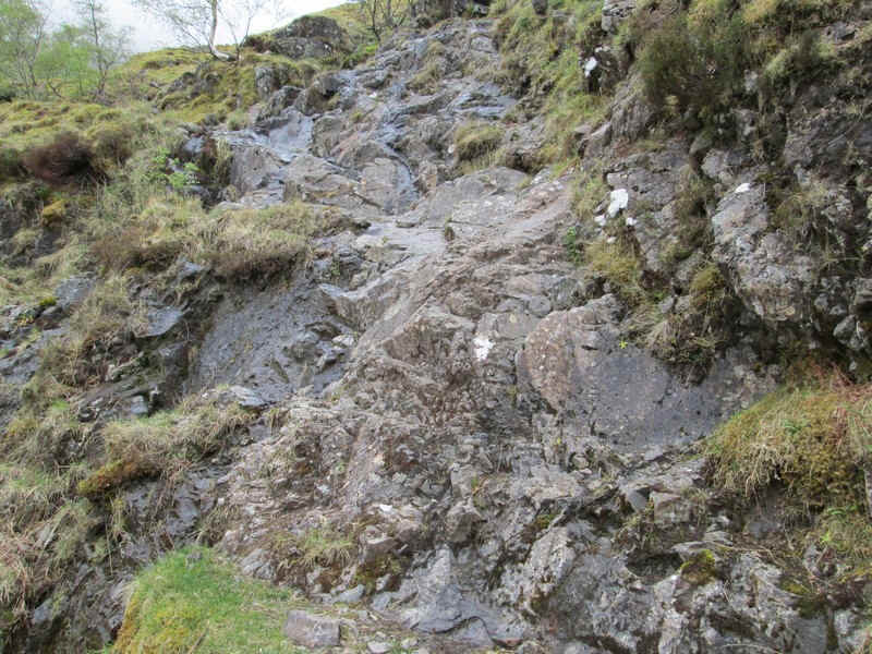 The problem area is little more than a few metres long and on the way back down I decided to risk falling in the water. In spate conditions or when the rock is slippery or icy it could be risky to attempt it. (down)