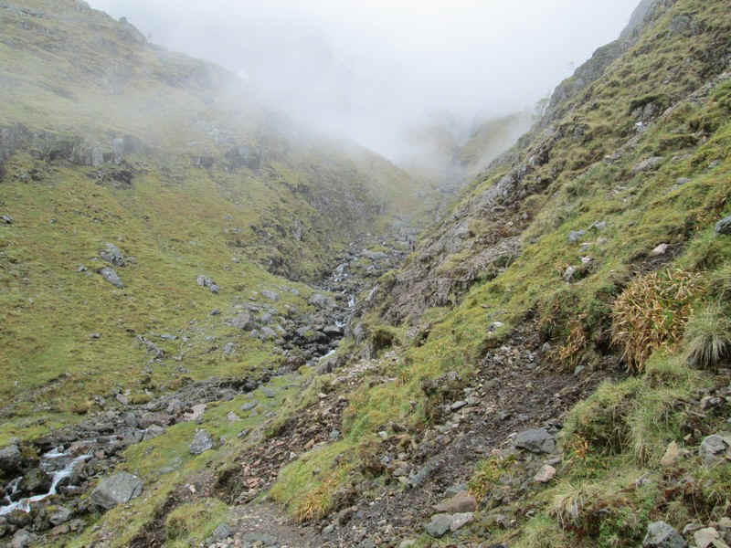 The path now arrives at a ravine where the reconstructed path promptly disappears and it's a horribly eroded scramble down to the stream. (up)