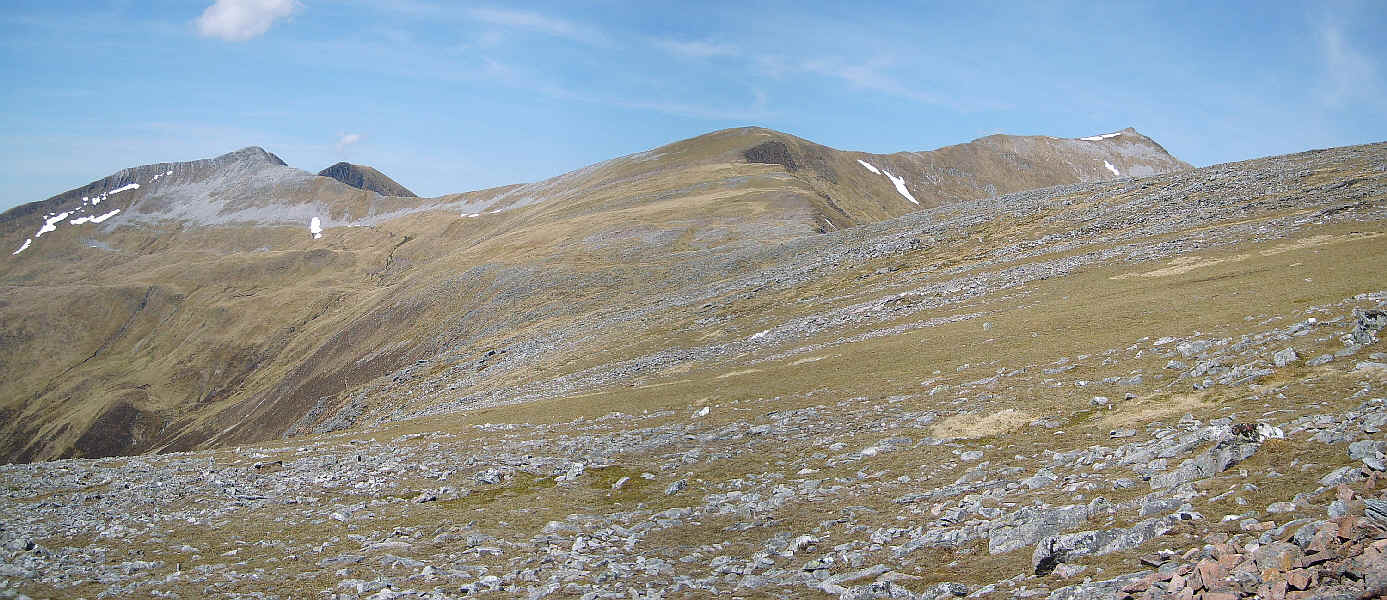 Ahead is this panorama of the rest of the day's high level walk. Over to the left is Na Gruagaichean, whilst in the middle is the 1062m south top of Binnein Mor and on the right the 1130m summit of Binnein Mor itself.