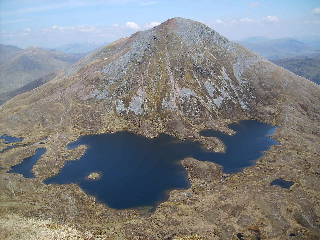 There's almost a helicopter view of Sgurr Elide Mor and the lochans in Coire an Lochain. The photo was taken from the edge of the cliffs on Sgor Elide Beag.