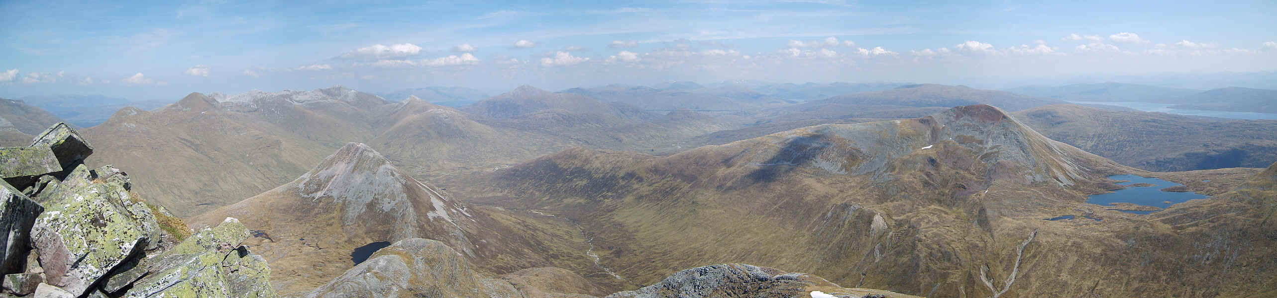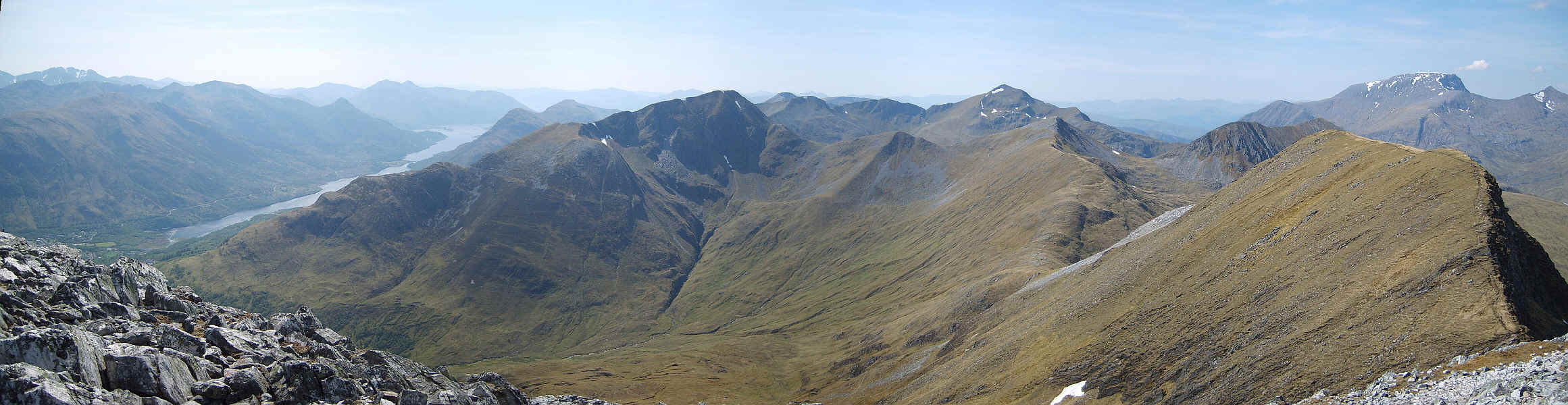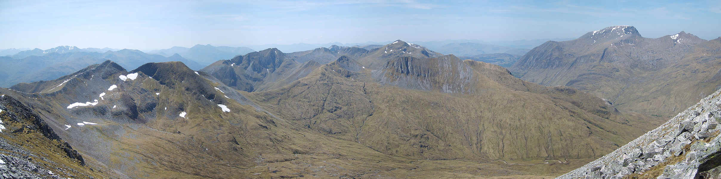 The first panorama is over to the west showing the summits (from left to right) of Na Gruagaichean, Am Bodach, Stob Stob Coire a'Chairn, Sgorr an lubhair and An Gearanach. On the right hand side is Glen Nevis with Ben Nevis and Carn Mor Dearg beyond.