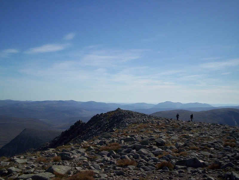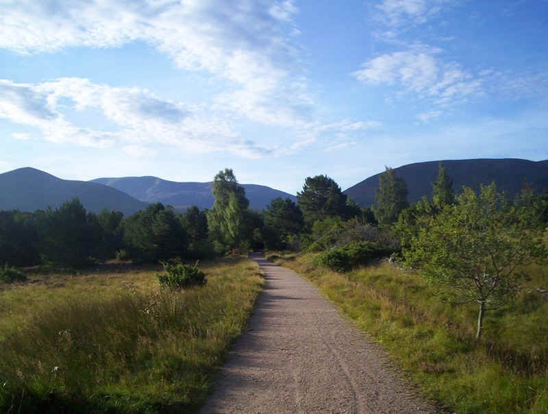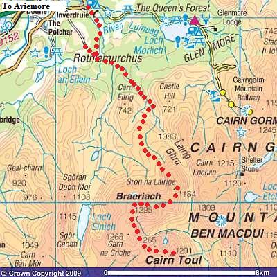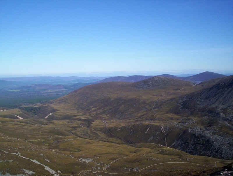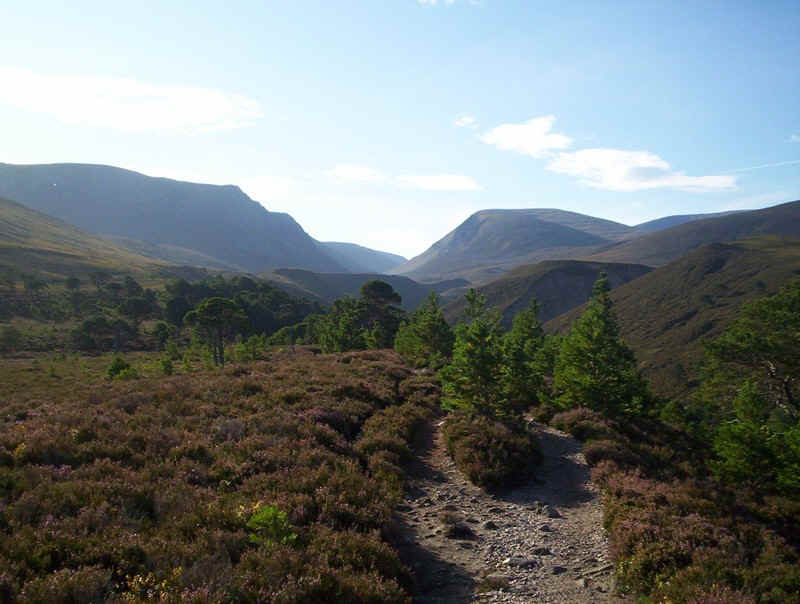 A beautiful September morning in 2009 saw me taking a taxi out to the Whitewell car park just outside Aviemore. I can certainly recommend Weirs Taxis for reliability and a reasonable enough price. The first few kilometres are very easy walking along tracks through the woods of the Rothiemurchus estate. The northern corries of Braeriach dominate the centre left of the photo.