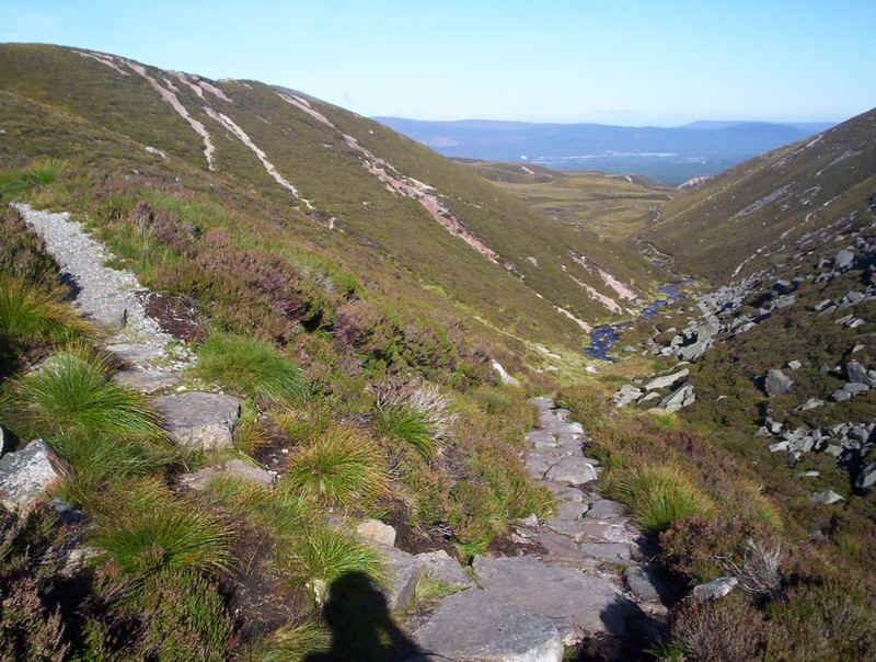 The path through the Lairig Ghru climbs steeply up a constructed staircase to reach a new path to Braeriach. Be warned that the original path is now in a very eroded and dangerous state and should be avoided on the return.
