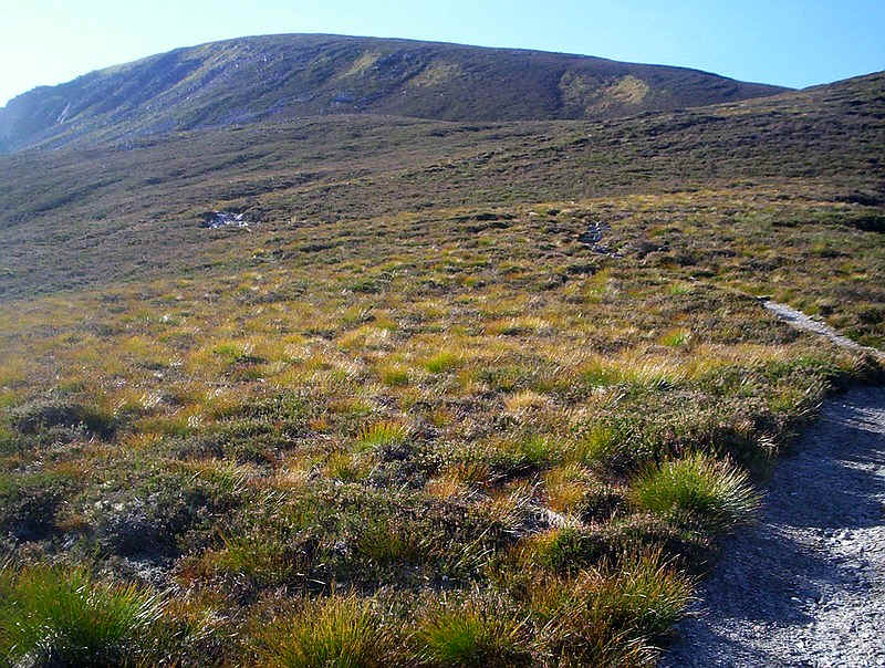 Looking downhill the old eroded path can be seen in the lower centre of the photo with the new path curving around to the right. The Chalamain Gap path can be seen climbing uphill to the boulder strewn gully at the crest of the slope - not a good route in my opinion.