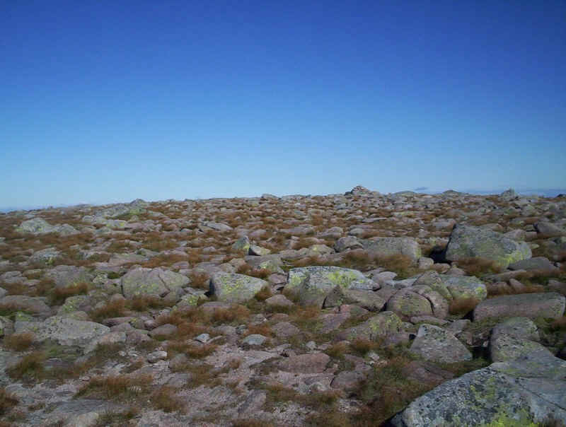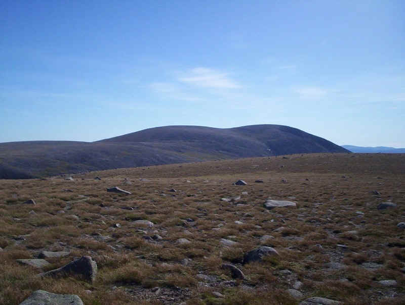 More round boulders litter the summit with Sron na Lairige's cairn in the distance.