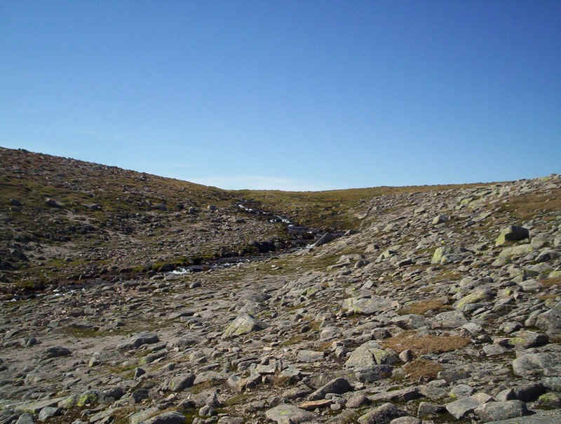 The walk across the plateau, despite rather a stiff wind was a delight, although by now I was beginning to get just a little tired of balancing on boulders! In this photo I'm heading off towards the Falls of Dee, the highest waterfall in Britain. In the distance is Carn na Criche at 1265m