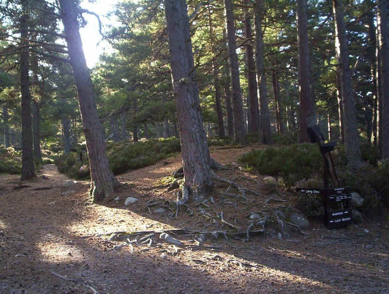 A little further on the path proper to the Lairig Ghru and the mountains starts at this junction in the forest.