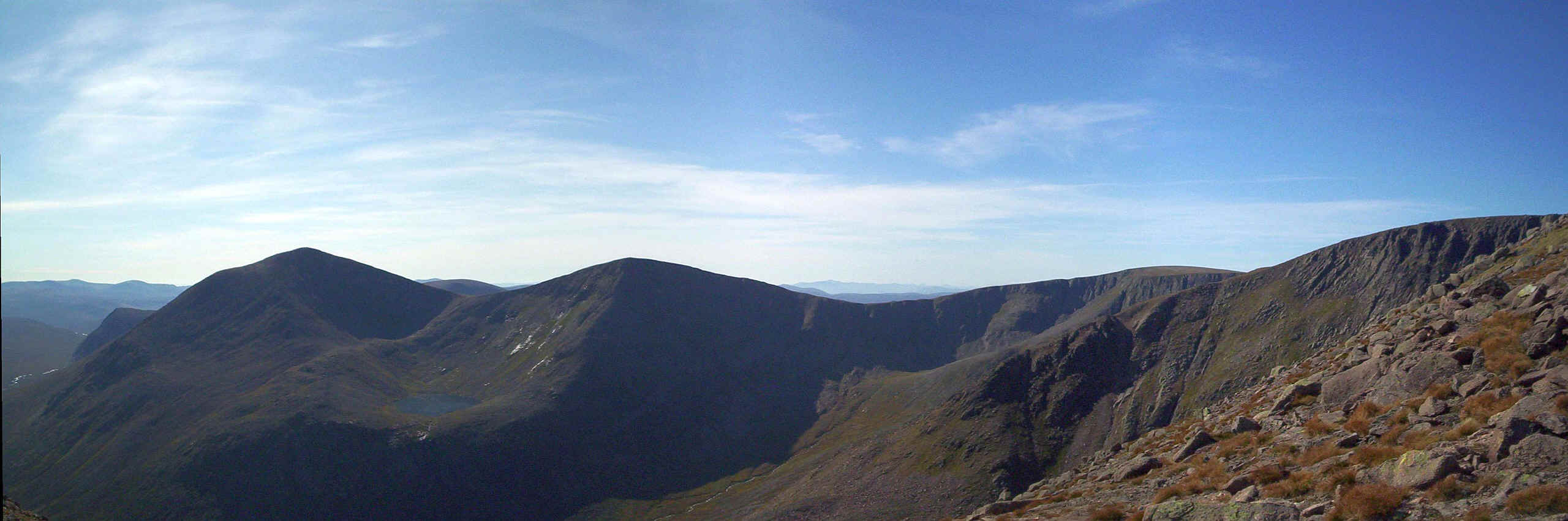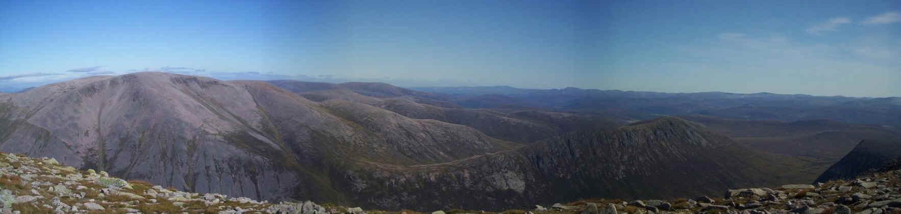 A panorama looking towards Ben Macdui on the left and Carn a'Mhaim on the right. Click on the image for a larger view.