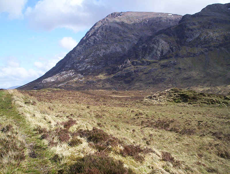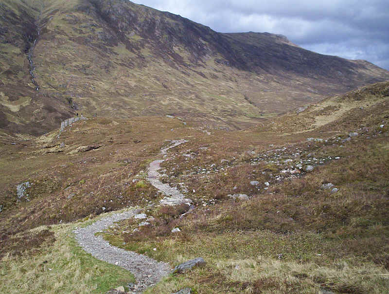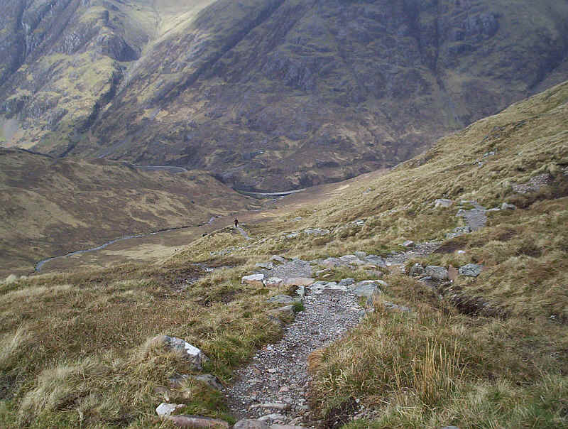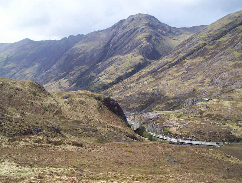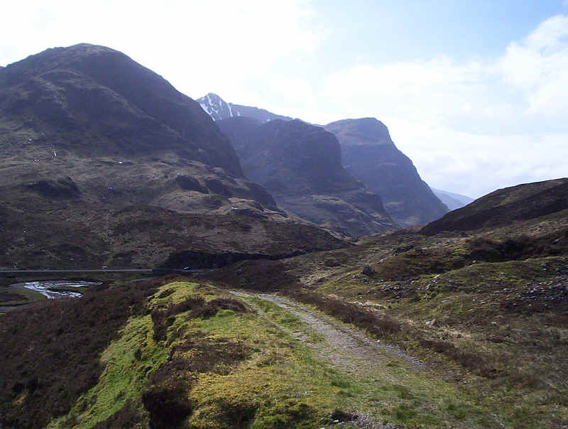 Here the path is almost down at the road, with the Aonach Eagach ridge and Meall Dearg towering above the glen. The road has been rebuilt on a concrete viaduct at this point.