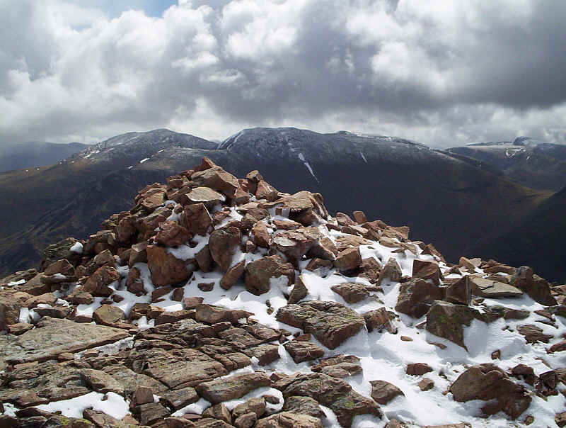 The summit cairn looking across Glen Etive towards Meall a' Bhuiridh and Creise.