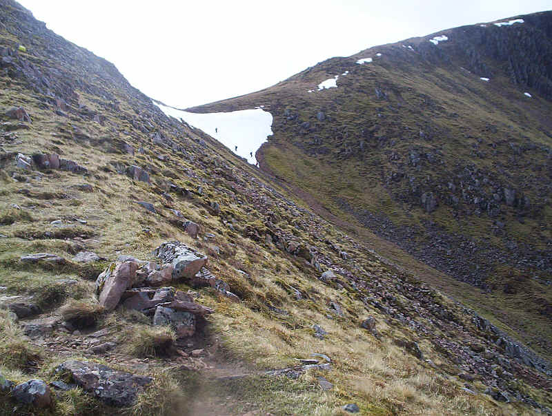 To my amazement four walkers were actually descending the snow on to the path to the valley.......... There are several tracks that lead down from the bealach all of which converge just below the snow.