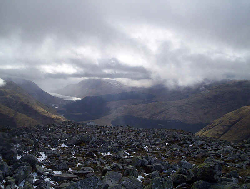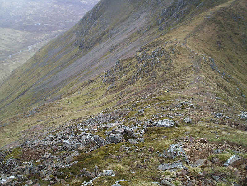 In the mist getting off the summit of Stob na Doire can be a little puzzling as there are several ridges all of which are narrow. However the one needed goes off down a rocky spur roughly SSW and has a clear track on it. Needless to say as soon as I'd dropped down a little the mist cleared and I was rewarded with this stunning view.