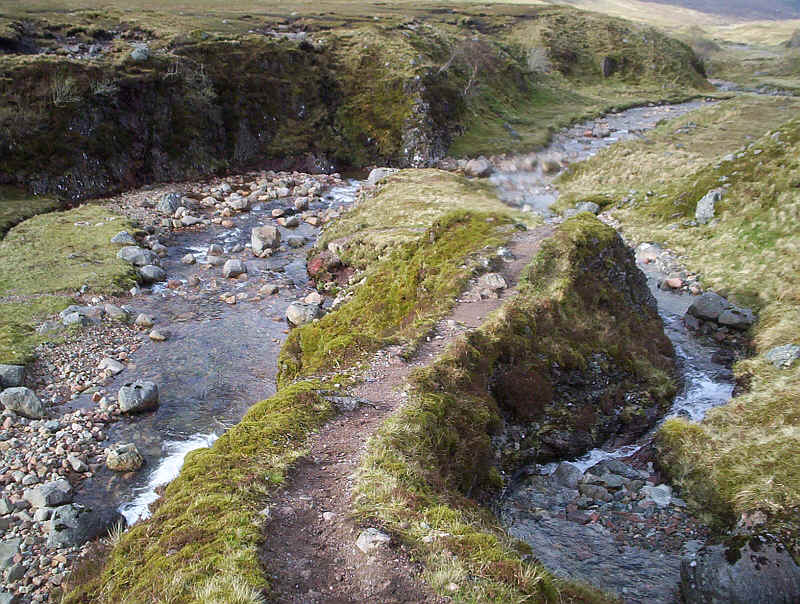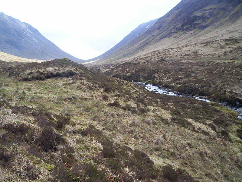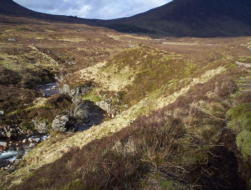 The path ends at this fascinating location on a peninsular between the stream from the corrie and the infant River Coupall. The river can be crossed here but I decided to walk along the right bank back to the footbridge over the river near Altnafeadh. It saves having to cross the river, walk through a boggy section and then tramp along the A82.