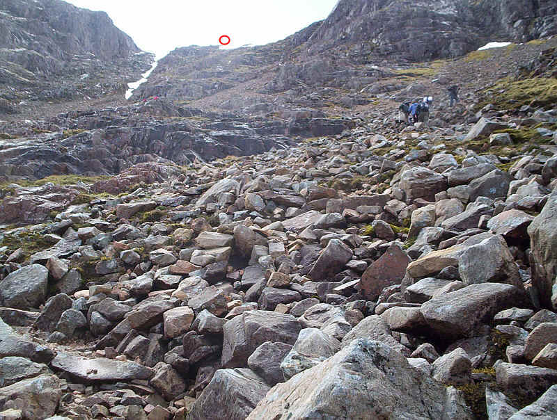Nearing the top of the corrie the track crosses increasing amounts of scree before turning to the left beneath some rock buttresses and heading towards the skyline. The track emerges on to the bealach above the corrie just to the right of the snow filled gully and underneath the red circle. There was still a large patch of snow here and, whilst I saw some people climbing over it, I decided it was safer to bypass it and contoured across to the right of the snow on rocky ledges.