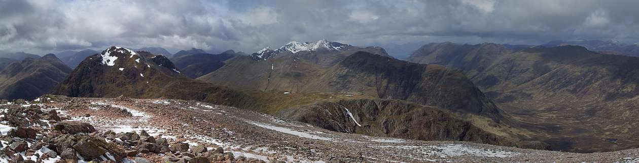 Below is a panorama looking westwards. The snow covered hill in the centre distance is Bidean nam Bian whilst Glen Coe is to the right. Click on the photo for a larger image.